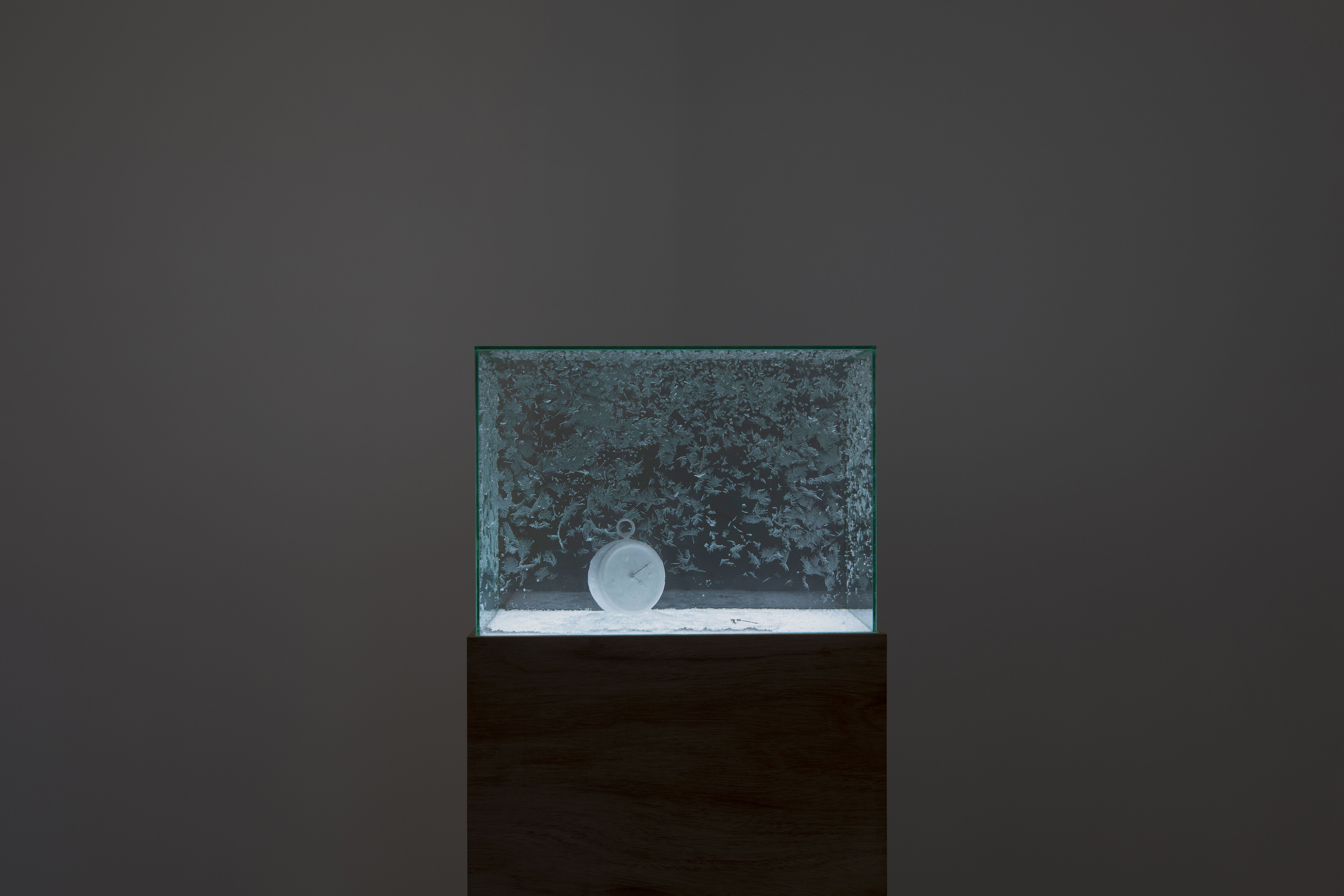 Aiko Miyanaga, "night voyage -clock-", 2023, glass box, mothballs, clock hands, mixed media, 20 × 55 × 40 cm + light base (100 × 57 × 22 cm). Photo Bruno Pellarin ©Miyanaga Aiko, Courtesy of Le Clézio Gallery